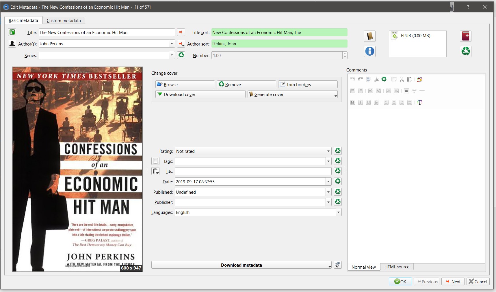 My issue is that it takes forever for Calibre to do it's initial scan (Job). So i have disabled my device from Calibre so i'm able to use the software. However i now have created a small nightmare, as when i copy manually to my device (note 4) the file is copied as Calibre created it in it's folder. But i believe that when Calibre copied the file(s) it changes the file name ("The War" becomes "War, The"). Now i have 1600+ books that have tons of duplicates due to this issue. In "edit metadata" i see no way to easily change the "title sort" (where i believe the problem lies) to reflect the actual title of the book and the file calibre creates in it's folders. Not really wanting to copy and paste every book with an "A" or "The" in it's title to match. In other words, i don't really care how they are sorted, i just want them to match. So my thinking here (likely flawed!), is to start completely over and rename every book's "sort title" (manually type in to override calibre's insistence on modifying) or find an easy way to manually copy the files over so that they remain unaltered so i don't have to rename every file. Is there a setting in "edit metadata" that automatically names the files as they were meant to be (without modifying the "the") or is there a way i can list all my book files (just the epub, pdf, etc) so that i can easily copy them over to my device without having to open up each and every author folder to get to the file to copy it. I sincerely hope this all makes sense! thanks for any help you can lend, Tom Last edited by tomx2; 09-03-2019 at 04:37 PM. |