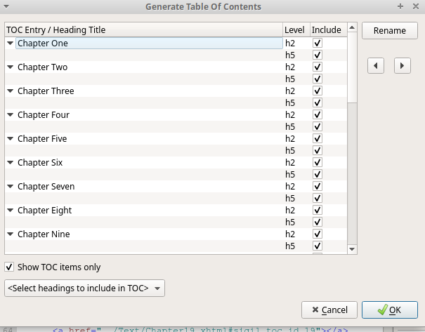 <h5 id="sigil_toc_id_1"></h5> Fortunately, nothing shows up on the Kindle. I went to the TOC and all the H5s are there, as well as the H2s for my chapter headings. Any idea how the H5s got in there? And so just go through the TOC and delete all the H5s? Or should I just leave them since they're not showing up on the Kindle? Thanks. |