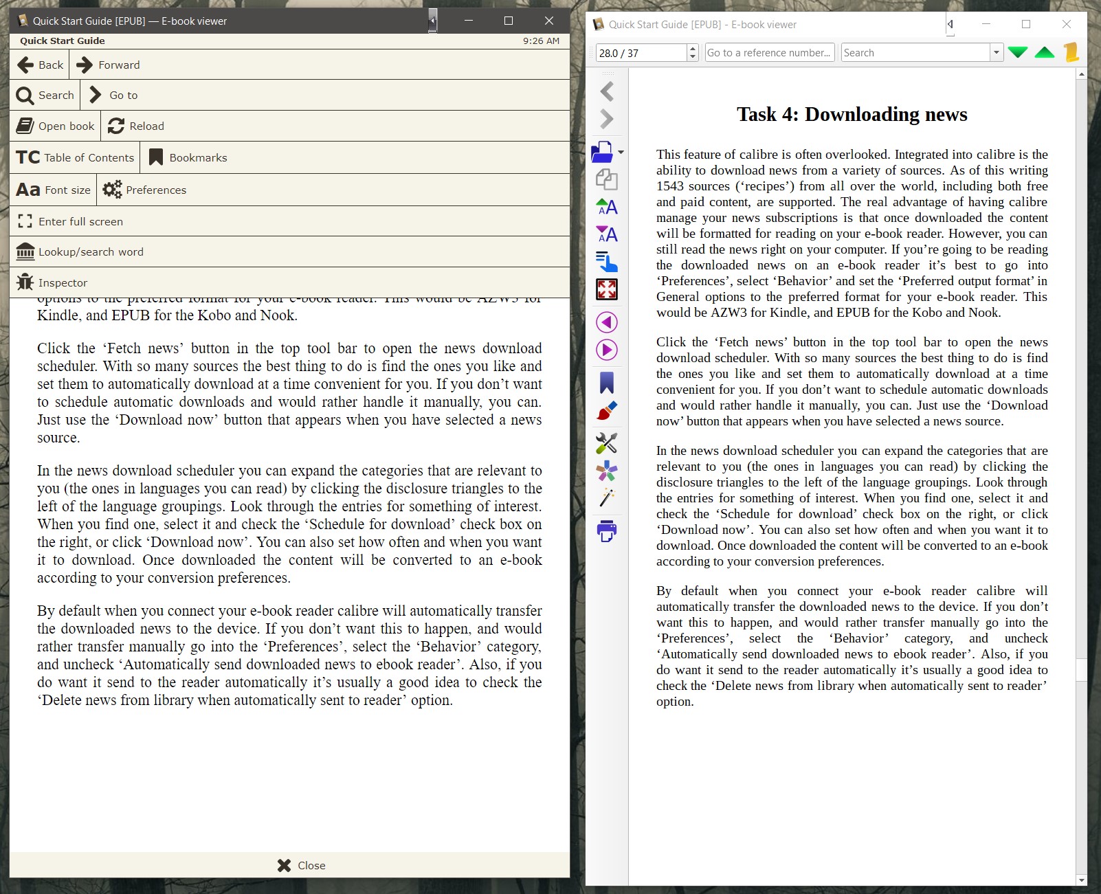 This new version also lacks a functionality that the old one had that I made regular use of. While having the percentage there is a nice addition, I also really need the previous current/total "pages" that used to show in the upper left corner. Even if they aren't real pages, I found it much more useful than a percentage in determining how much progress I'd made. On top of that, I would also use it to navigate to a specific spot in the ebook, which isn't even currently available in the "Go to" controls. I kind of wish I could downgrade the viewer without downgrading the entire program. Hope to see some improvements in future releases and I hope bringing the sidebar back as an option for those that want it will be possible. |