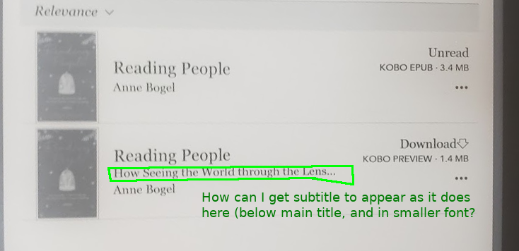 1) The top one is my personal copy 2) The below one is a library/overdrive copy. This version has the subtitle ("How Seeing the World through the Lens...") is below the title ("Reading People) and is in smaller text. Is there a way I can have all my personal books' subtitle in the same way? How? |