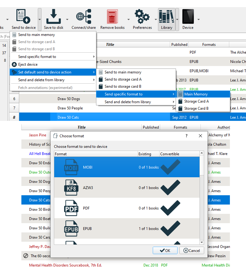 Hi there. I'm setting up my system on a different computer. I can't figure out how I set it up before. I had it so that when my Kindle Fire with Calibre Companion was 'attached,' if I clicked the "Send to Device" button on the toolbar, then a list of file types would pop up. For PDFs, I just click the button to "send as PDF," but for EPUB files I could select "send as MOBI." Calibre would then convert the EPUB to a MOBI and send the mobi to CC all in one go.