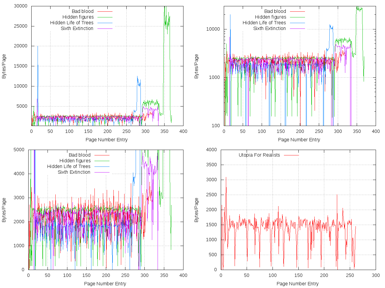 The table in post #1 took so long that I forgot to attach and comment on the data plots. Most books seem to be between 2500 and 3000 bytes per page, but there can be quite a bit of variation, with Ford's autobiography is around 2000 and Utopia For Realists 1500.