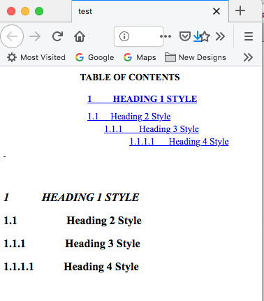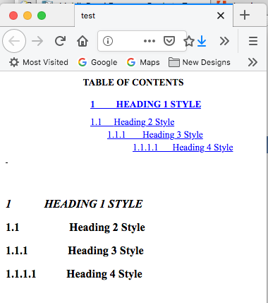 The HTML was generated via Word's "Save as HTML". There are two variants: Unfiltered: This has the funky mso markup. This is the format that was sent with the horrendous markup. Filtered: This is a relatively clean HTML version. Attached is the output in the filtered format and a screenshot of via Firefox. The results are the same with the body headings rendered correctly. |