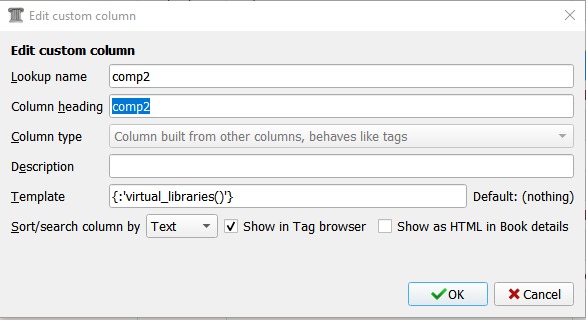 Thanks Chaley. I set this up at the time you posted using option number 1 (because I thought I understood it and using it saved me investigating all about plug-ins) and it seemed to work as I had hoped. However, on opening calibre now, in my new Virtual Libraries column most entries read "TEMPLATE ERROR maximum recursion depth exceeded" but two read "TEMPLATE ERROR maximum recursion depth exceeded in _instancecheck_". Outside of those, one title is correctly labeled in the column but doesn't appear in the "VL not yet assigned" virtual library, and one title shows up in the "VL not yet assigned" virtual library but the field is blank in the Virtual Libraries column. (Note to TheDucks: Your message was too cryptic for me to decode. )A search on the error message shows nothing in the forum. If there is a quick fix, I'll stick with option 1. Otherwise, I'll undo what I've done and experiment with the plug-ins. Any advice? TIA. |