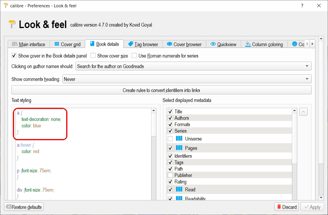 I just installed the latest release and noticed that all the font colors that are hot linked in the book details panel are a light blue. It's a really hard color for me to see so I was wondering how I go about changing it back to what it was. Even in the metadata the comments formatting options are all the blue hued icons.