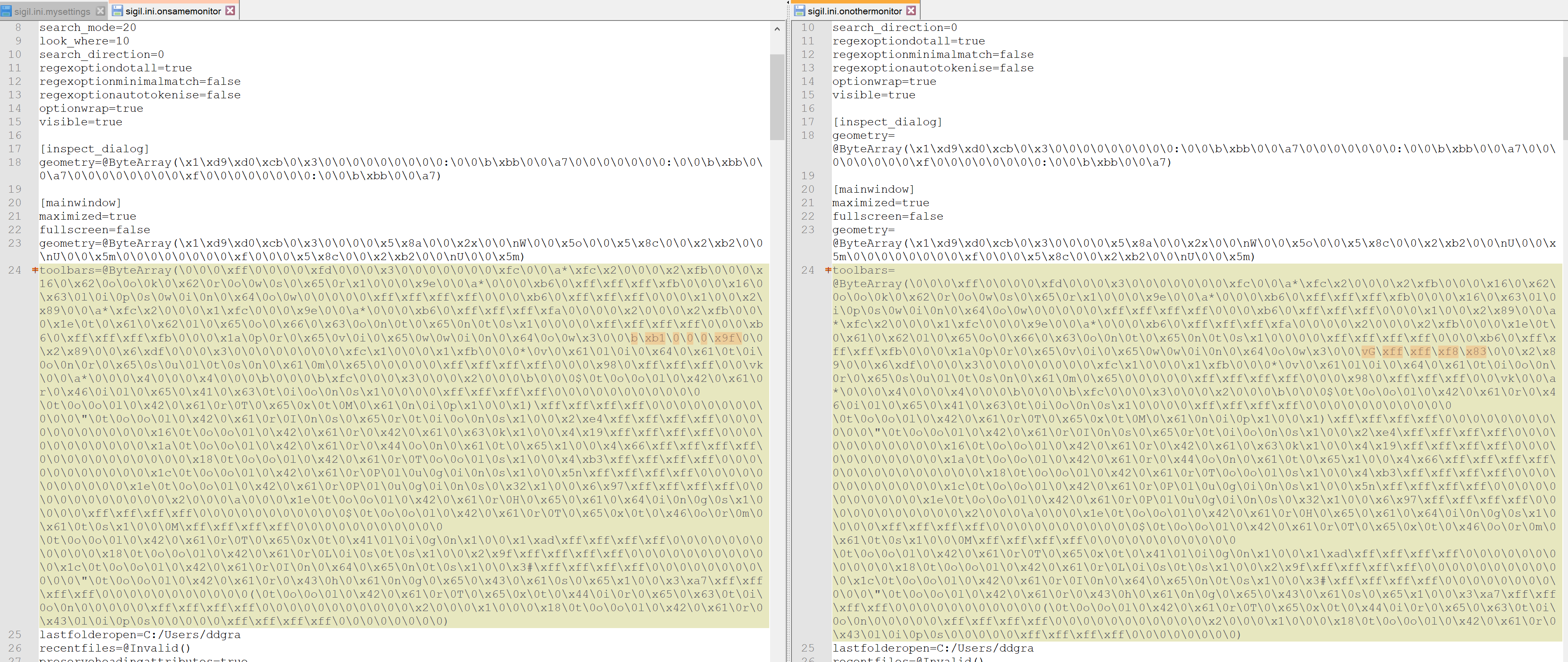 From your ini file it shows that in both cases the Sigil app is Maximized.