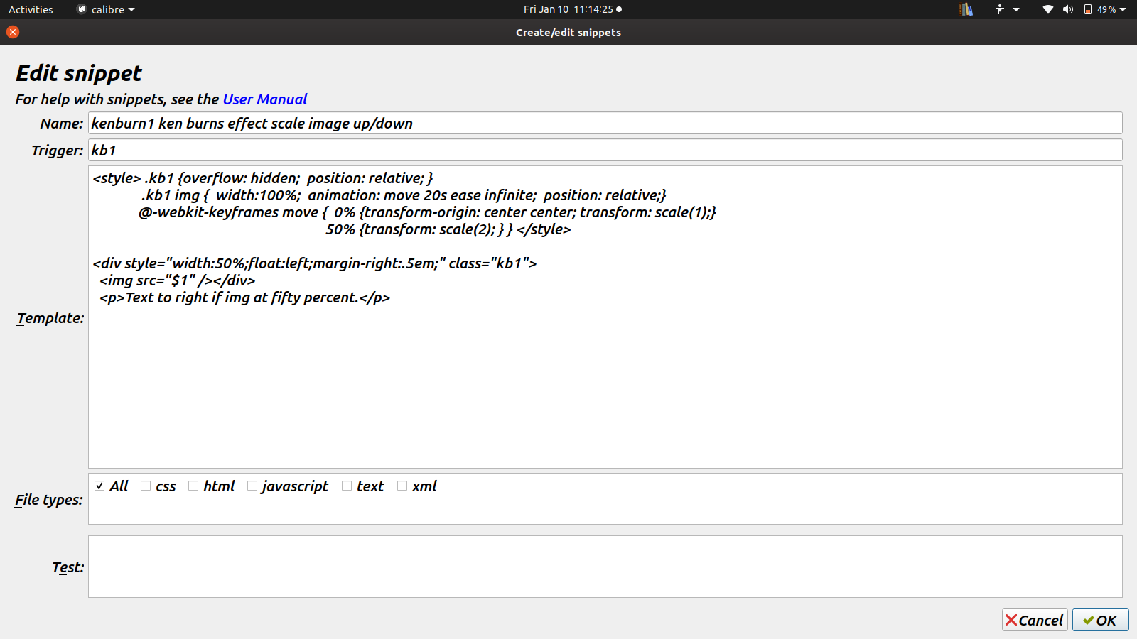 You can copy this screenshot text into calibre snippets, then invoke it in the editor with kb1 followed by ctrl-j. The <style></style> command and a template for an image will appear with the cursor at the $1 placeholder. You can start typing any img already in the book. It will autocomplete. immediately the img will zoom/unzoom according to your set speed. Use sparingly for good taste. Unlike videos and even animated GIFs, this uses up very little overhead. I uploaded editor image as an animated GIF and from that you can see the img moving, but I fear that when uploaded it will show on this forum only as a still picture. See calibre manual how to add an img to editor and how to add a new snippet. The very first time I ever saw "The Ken Burns Effect" was in his best documentary "The Civil War". Best regards, Pop