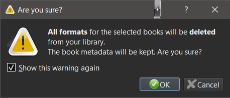 The drop down menu has these entries Remove Selected books Remove files of a specific format from selected books Remove all formats from selected books except Remove all formats from selected books Remove covers from selected books and then, with a divider Remove matching books from device I have a library of several thousand books, I select them all and then go to this menu to remove all the unwanted formats but, with a slightly shaky hand I have in fact inadvertently selected Remove ALL formats Thank heavens for good back ups. I just wondered if it were possible to insert a divider between all of the options to make it less easy to select the wrong option, because once the process begins it is not possible to stop it. Thank you for answering this comment personally. It is not very often you find this level of personal attention. I am very grateful for Calibre Lloyd |