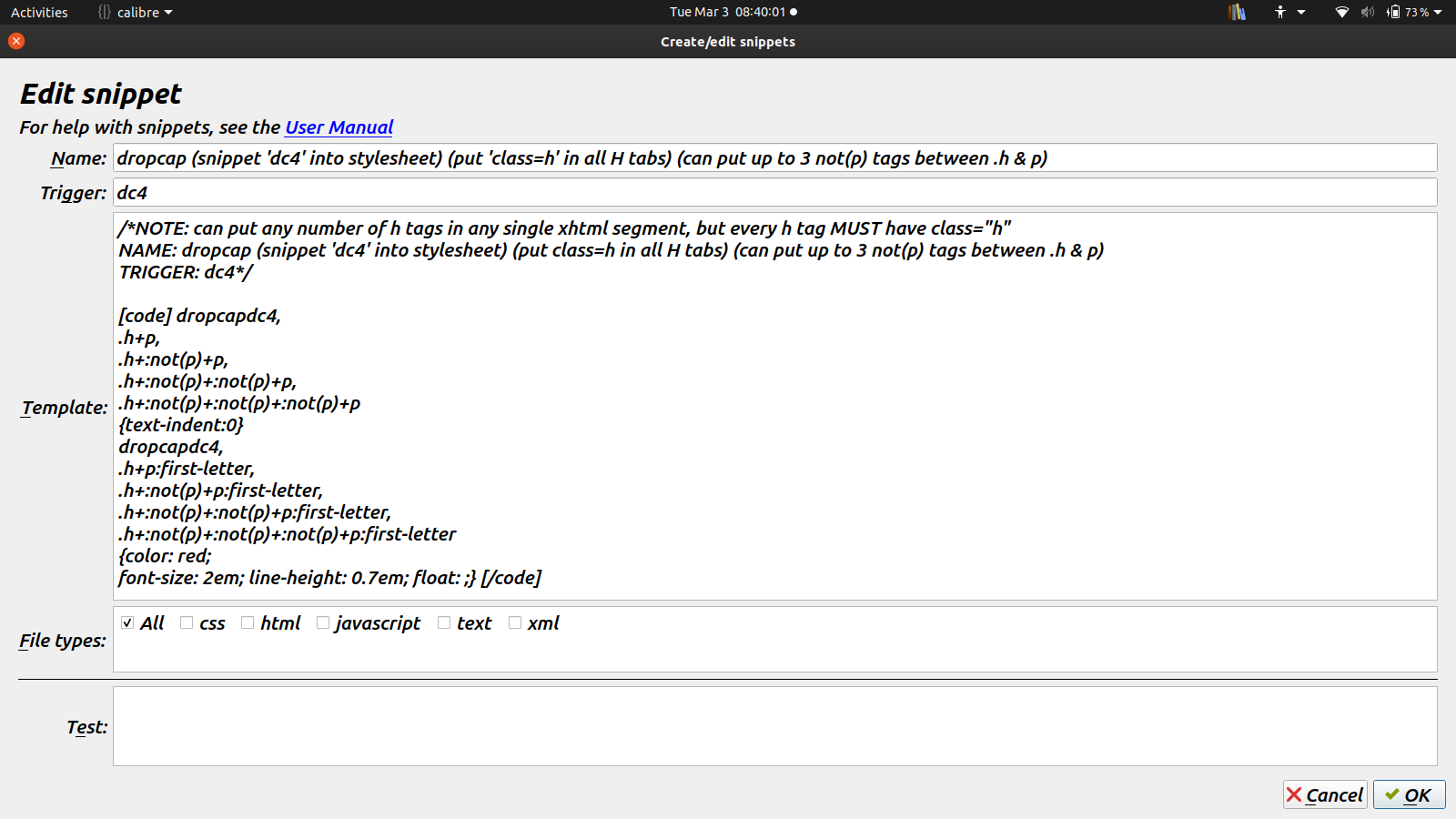 NAME: dropcap (snippet 'dc1' into stylesheet, then type class="dc" in xhtml) (use ANYTIME for single-instance SINGLE-LETTER dc, usually after p in <p>) TRIGGER: dc1 */ Code: