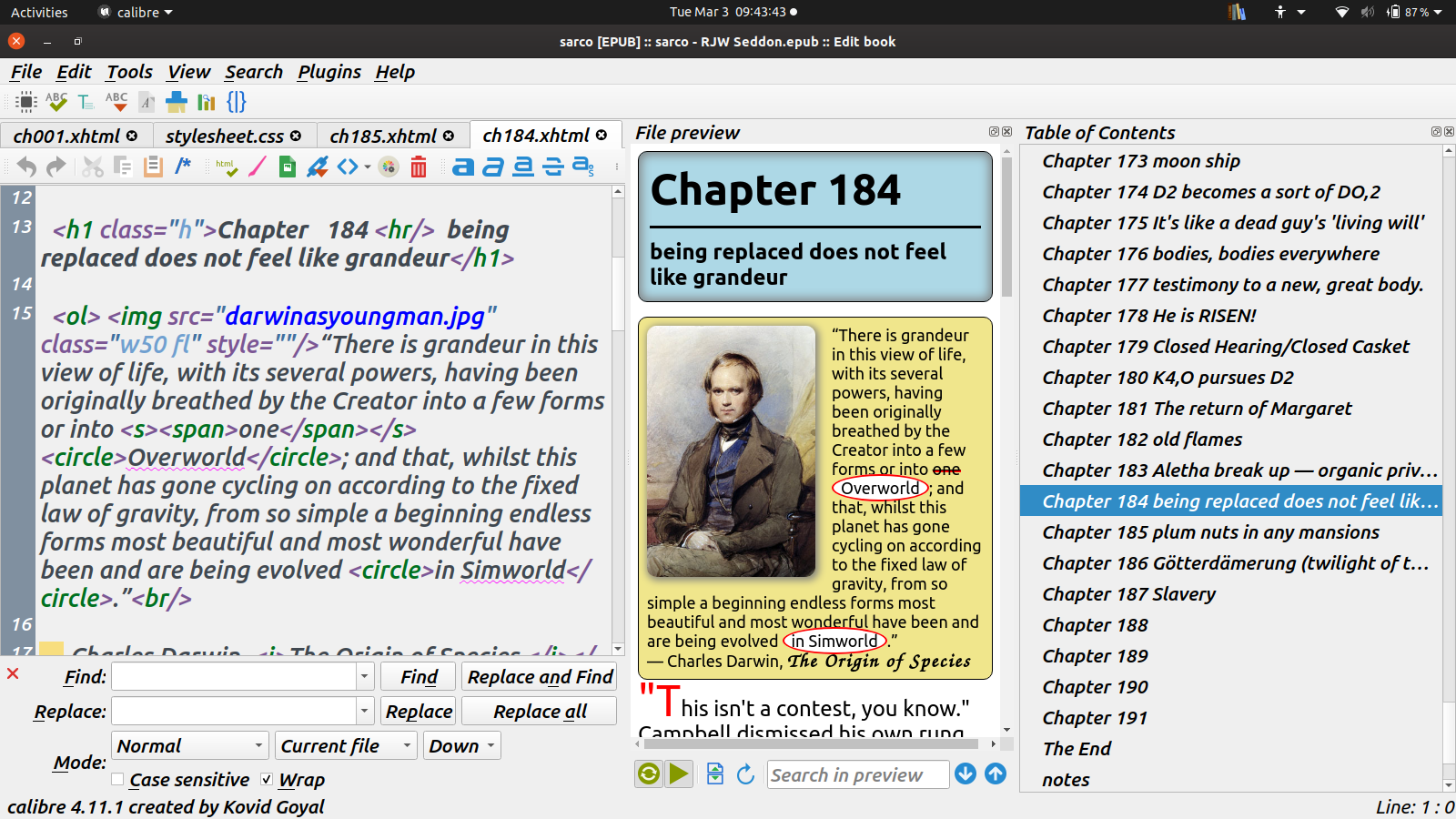 I have been interested for a long time in the best ways to visually enhance epubs by adding CSS code. I have 9 different ways of making DROPcaps and here is the first. I put in all nine of them in my snippet file and can call them up in the stylesheet.css with the trigger followed by ctrl-j to expand. This first one is one of my favorite. It requires you to put class="h" in every H tag first, but lets you mix in more than a single H tag within xhtml chunks. This one lets you follow any H tag with as many as 3 other things before the P tag. Add float:left to convert TALLcap to DROPcap.
