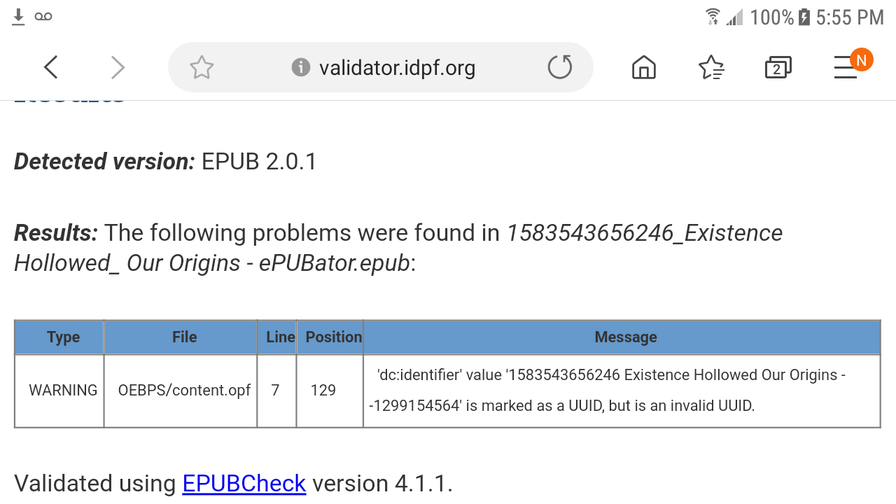 "EPUB Validator (beta)Results Detected version:*EPUB 2.0.1 Results:*The following problems were found in*1583543656246_Existence Hollowed_ Our Origins - ePUBator.epub: TypeFileLinePositionMessageWARNINGOEBPS/content.opf7129'dc:identifier' value '1583543656246 Existence Hollowed Our Origins - -1299154564' is marked as a UUID, but is an invalid UUID. Validated using*EPUBCheck*version 4.1.1." From http://validator.idpf.org I am trying to get entered into premium status on smashwords. Com I tried to edit the uuid in the opf file and i caused 3 new errors Ill attach the epub only having the uuid error Can you please help me pass all tests at http://validator.idpf.org I am using a android smart phone If you will fix the error for me much love If youd prefer to tell me how to fix it much love Thank you fameily