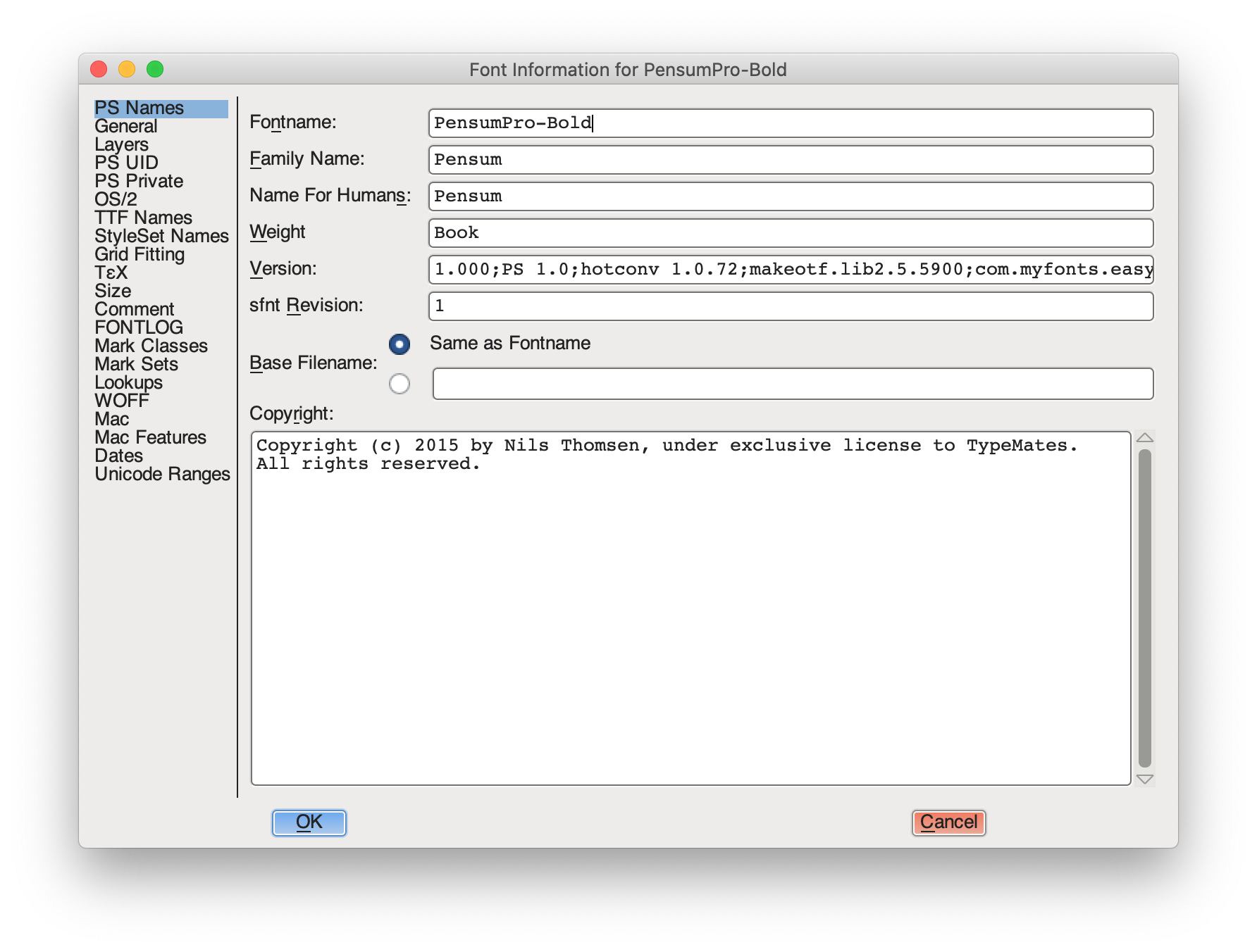Your first image is too small to read any detail but based on the second image it looks like you need to change the internal name to PensumPro in each then also change the external filenames to: PensumPro-Regular.ttf (or PensumPro.ttf) PensumPro-Italic.ttf PensumPro-BoldItalic.ttf PensumPro-Bold.ttf |