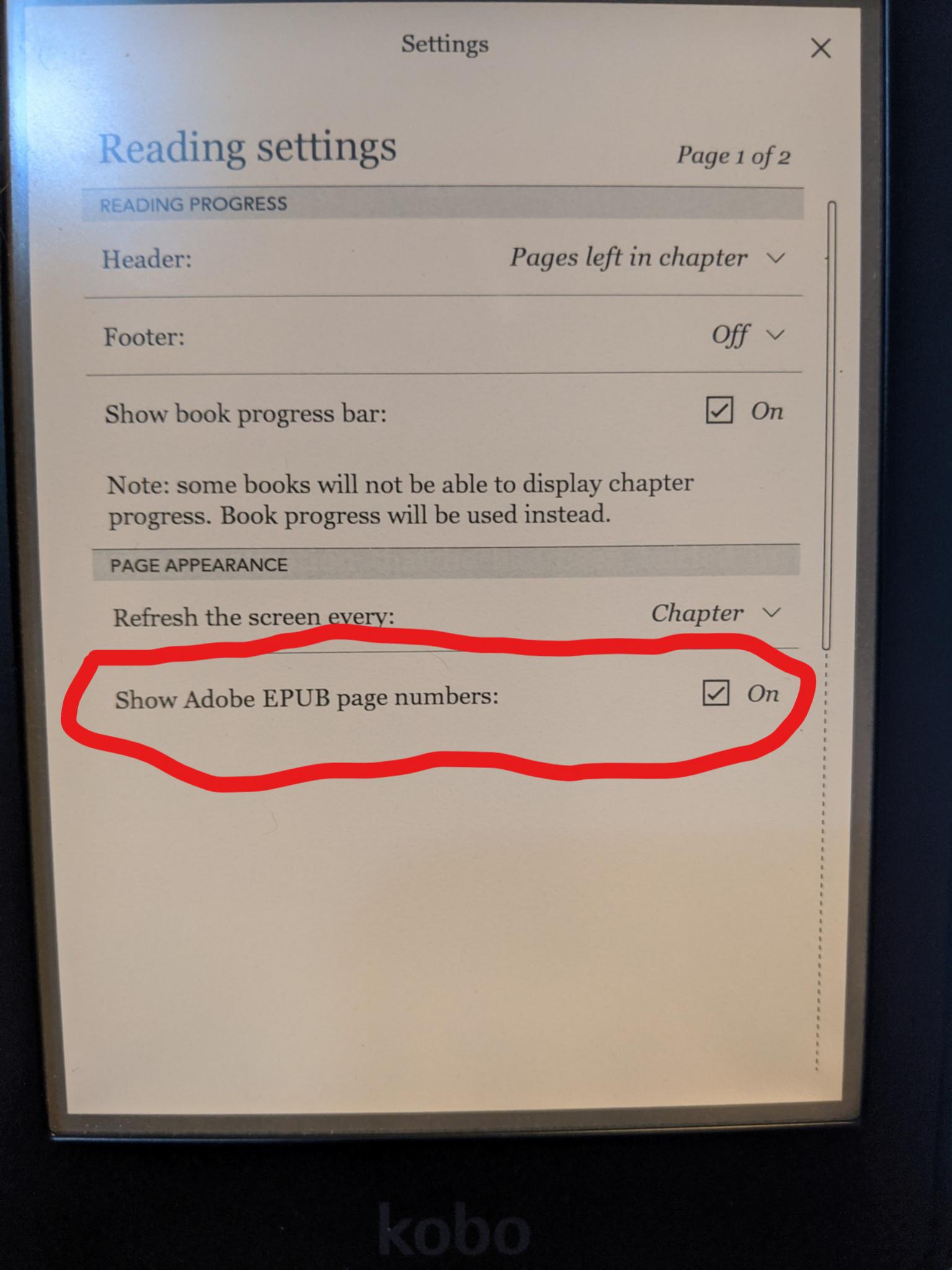 @walhir: There page numbers aren't in the wrong spot. With the Adobe page numbering algorithm, a screen does not map to a page. The page numbers in the margin show where the page starts. And you can turn them off if you don't like them. And if you don't like the page numbering used, there is a lot of discussion about it both here in the Kobo forum, and elsewhere. |