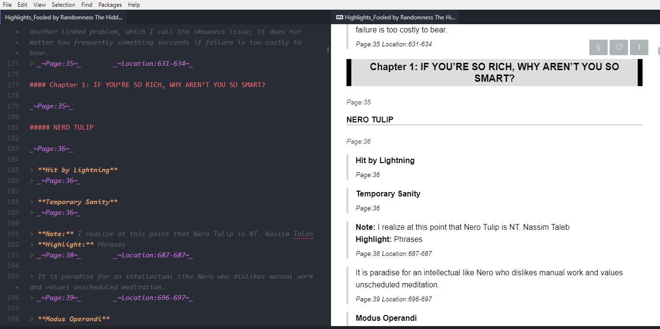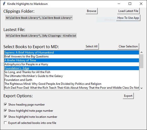 I have been using the Kindle Oasis for the last year. I have books from Amazon and side-loaded books on my kindle. I use Calibre for book management and Kindle Mate to manage my highlights and vocabulary words (delete words, delete duplicated highlights, ...) Exporting highlights from kindle mate gives an excel sheet which never felt satisfactory to me. I wanted a well formatted PDF or HTML that I could save or print and that is organized by section/chapter/headings. What I did, is create a new highlighting/noting method I use on my books while reading (special notes and symbols), so that when I give the clippings.txt file to my program, it generated a markdown(.md) file with all the highlights. I then use Atom or an online tool (link in usage doc below) to save that to HTML or PDF (I don't remember why I didn't go for HTML directly, but it was a hassle). Anyway, Atom allows you to set your CSS styling when viewing a markdown file, which is good. I just felt like sharing it, as I just added a basic GUI (it was only a script before) It only works with English books for now, and I am not sure what kind of bugs might pop up. It is currently working for me. If you're interested, read the usage document here I do not have any real github experience to get this on github, so it is on my Google Drive for now (the python script is there if you want to check it out too. P.S: it is a bit messy) |