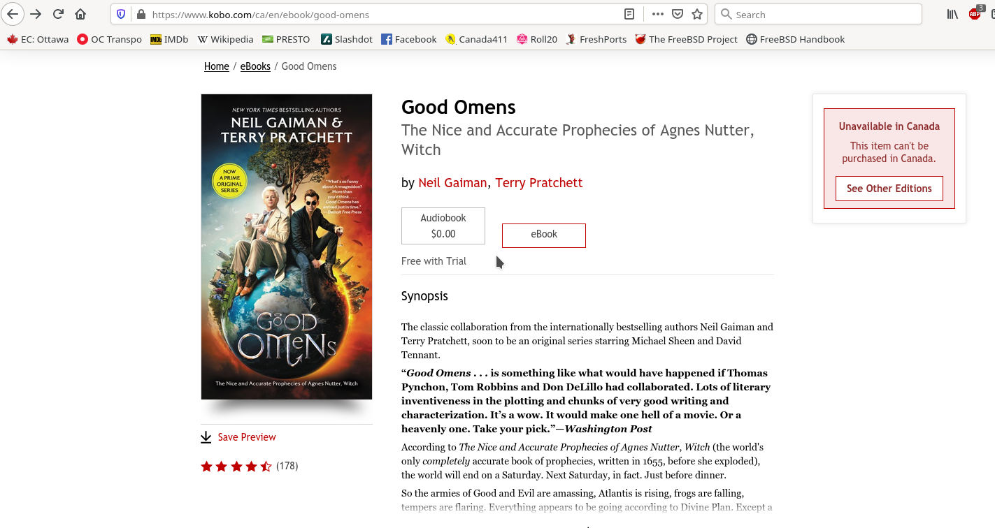 So, I went looking for Good Omens on kobo.com yesterday. Couldn't find it. Found the script book, found the companion, found the audiobook... but not the ebook.