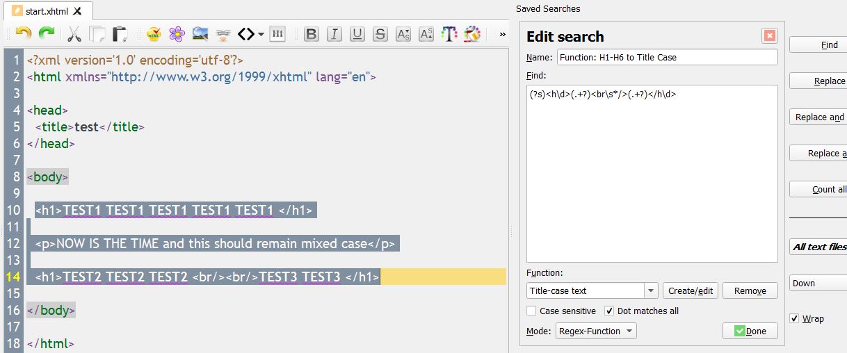 <body> <h1>TEST1 TEST1 TEST1 TEST1 TEST1 </h1> <p>NOW IS THE TIME and this should remain mixed case</p> <h1>TEST2 TEST2 TEST2 <br/><br/>TEST3 TEST3 </h1> <p>NOW IS THE TIME and this should remain mixed case</p> <h1>TEST4 <i>TEST4 TEST4 TEST4</i> TEST4 </h1> </body> ... my Find expression Code: