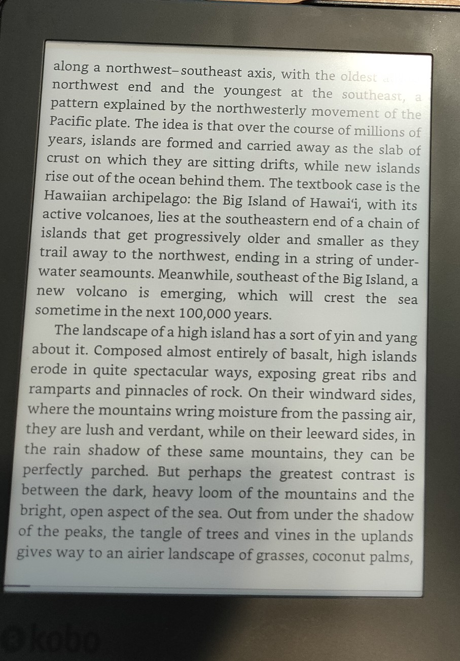 The clock appears in the upper left when you are on the home screen, library (and all the sub divisions of library), and the store (the tab for which is labeled discover). It also appears in your currently open book, but only when you've tapped to bring up menus otherwise it's invisible. Library screen - "books" "authors" "series" and "collections" tabs themselves appear smaller (i suspect those who use the large print mode will need it for them now). These tabs no longer show page x of y for how many pages of whichever you have, you can still sort them and in the case of the base library filter them as you are able on the previous firmware. The menu navigation they added (which is used on the home/library/discover screens) is fairly standard looking. There is now a "notifications" indicator, though I have no new notifications currently, I'm not sure what would go here other than maybe overdrive book loans which are about to expire, or new firmware waiting (I doubt this last one though). This indicator is an outline of a bell, I don't know what it'd look like if I had a notification for the previously stated reason. kepub page turns seem ever so slightly faster but I mean fractions of a second and I honestly don't have an issue with the page turns regardless. |