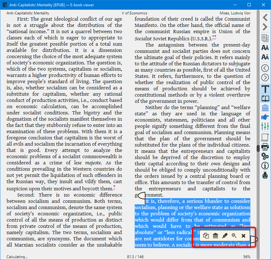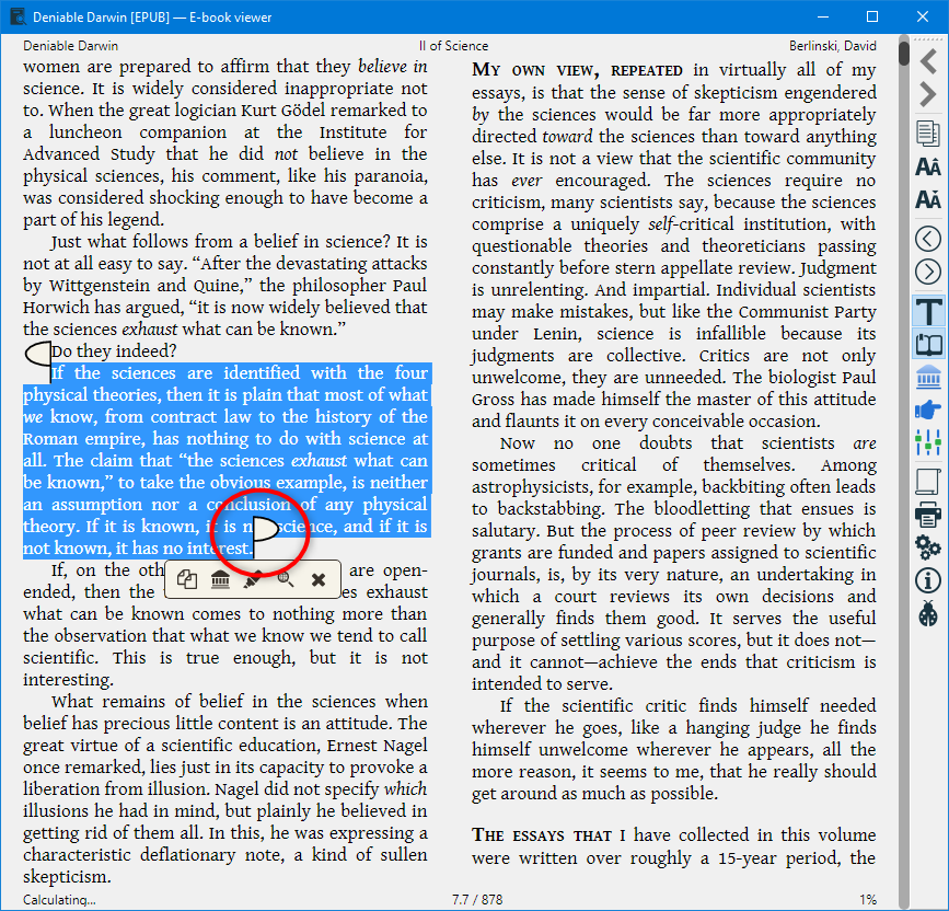 But wouldn't it be difficult for you to reproduce my results because font, font size, viewer window size, etc. would affect how the book was displayed so you would not be able to experience what I experience? But I can say the text is covered by the controls every time a paragraph in the bottom right corner of the viewer is selected. Showing the controls when a single key was pressed would be a very elegant solution IMHO and would ensure the controls never covered selected text. Here's another picture. |