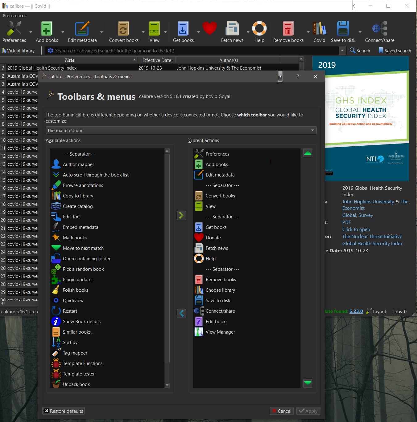 I recently downloaded the current version of Calibre, and I am missing the Preferences Icon. I thought that I might have corrupted the update, so I dileted everything, and started fresh with a new download. Same problem.