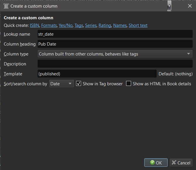 But something like this should work - untested You will probably have to do some formatting in the template to extract the year only, see ==>> The calibre template language BR Last edited by BetterRed; 10-04-2020 at 05:42 PM. Reason: Wrong image |