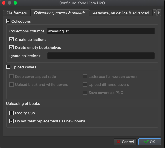 Or, if you have the KoboTouchExtended driver installed, you could be configuring the wrong driver. Check the driver when the device is connected. Right-click the devices button and select the driver configuration option thee. This will show the configuration for the driver being used. The "Update cached metadata to device" is for calibre's use. It updates a file in the root directory of the device to help calibre match the books on the device to the library. The device does not use it. |
