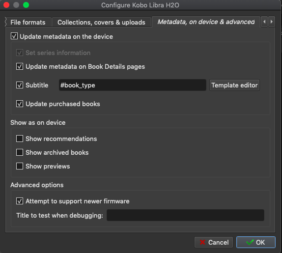 On a slightly different note, the 'Subtitle' feature doesn't work either. I've plugged in my Kobo and it goes through the plug-in process, I've updated the cashed metadata on device and I've into Kobo Utilities and updated the metadata in device library; these haven't worked either. What step have I missed? I've attached screenshots of my settings, but the debug file wouldn't upload... |