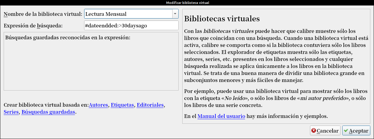 My custom column is named dateendded And build a virtual library to see the monthly readings with this syntax #dateendded:> 30daysago How could I see only those of the previous month? The date is calculated from the day of the date Therefore, it calculates business days, that is, it does not calculate Sunday. Solve the formula calculating 34 days Last edited by dunhill; 11-22-2020 at 07:44 PM. |