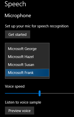 On windows 10 I have 4 default voices installed: George, Hazel, Suzan and Frank. I have selected per default Frank.