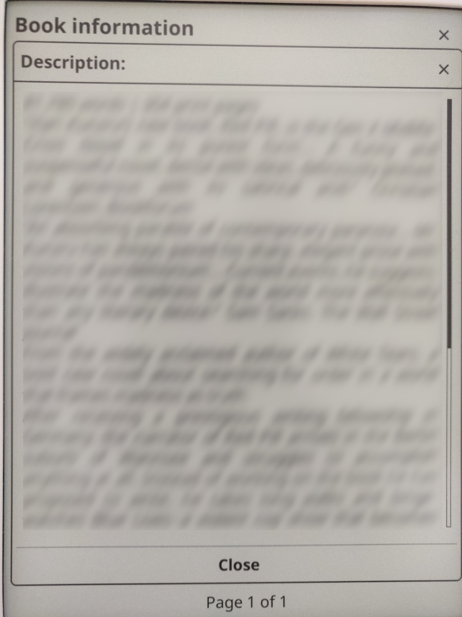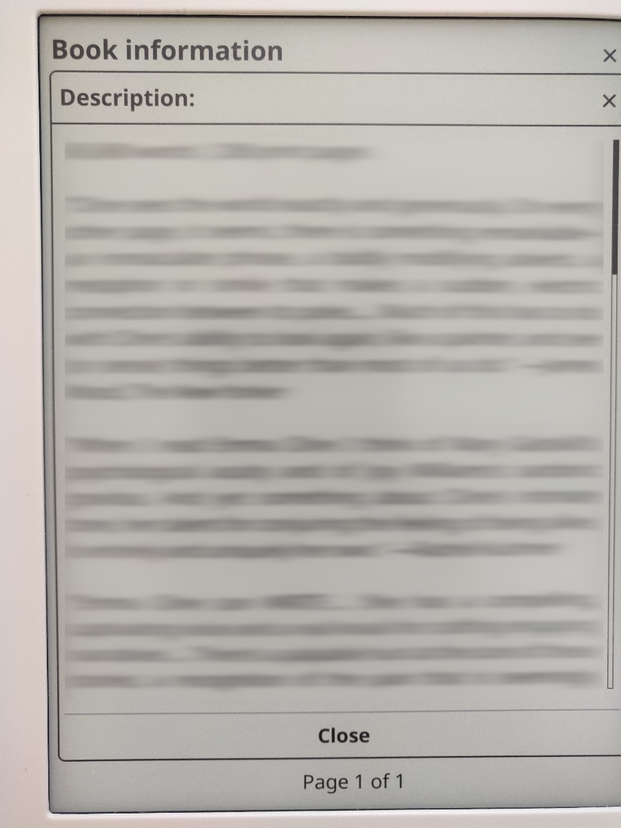 There's probably no need for the scrambled epub. Any epub with an opf file with multiple paragraphs of description in the <dc:description> tag will do. This is not a bug or something specific to a particular book. It's universal. Look at what KOReader displays when you bring up that description text the way I mentioned above. There is no spacing between paragraphs or indentation of the first line. In other words, all the paragraphs vertically render so that it looks like there is only one long paragraph. That's why I was hoping to use css properties like margin to create some distance between paragraphs, at least as long as the styles didn't affect anything in the text of the books themselves. The Nickel reader seems to do this by whatever means it uses. I can get around this in KOReader by putting a paragraph containing only a space Code: