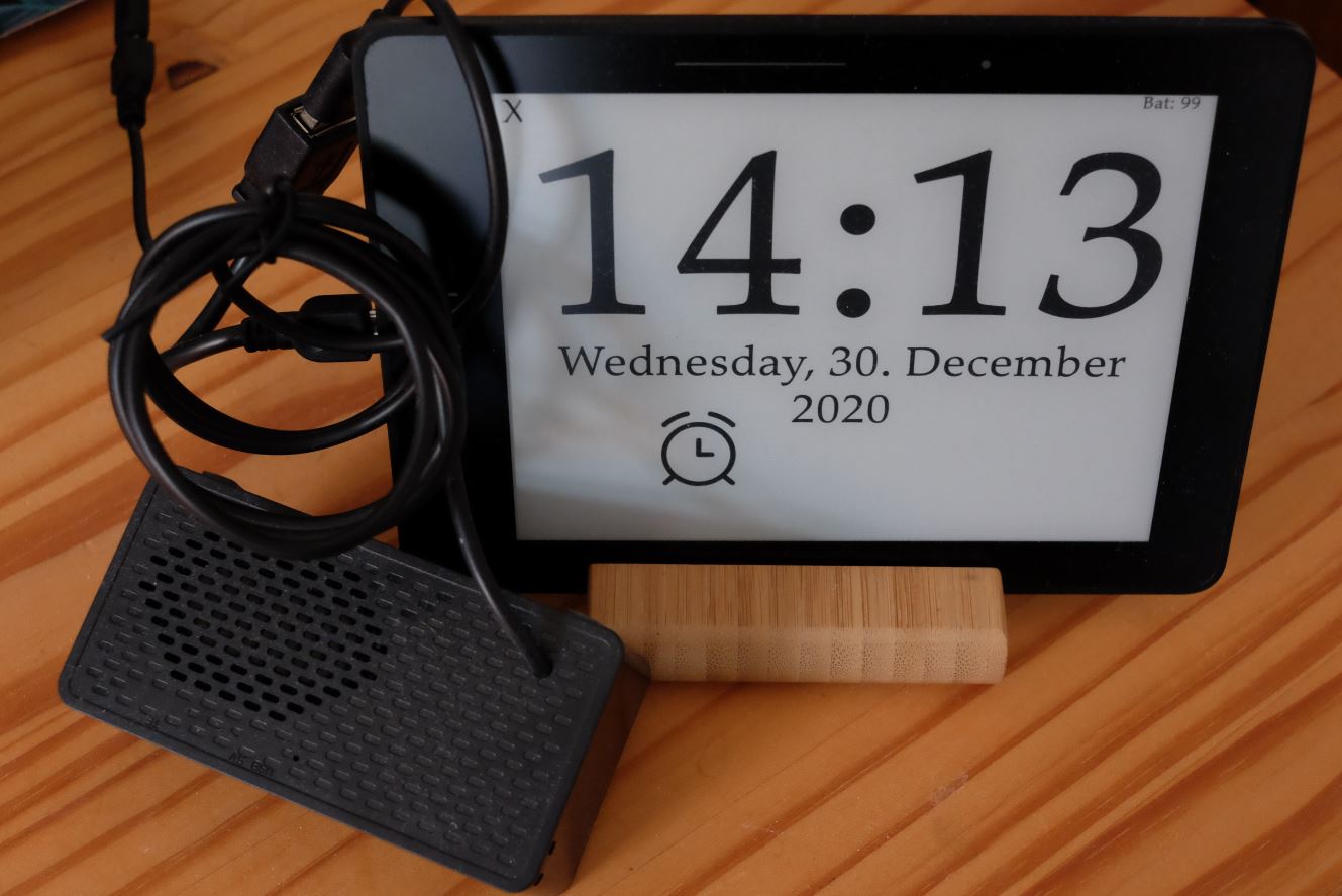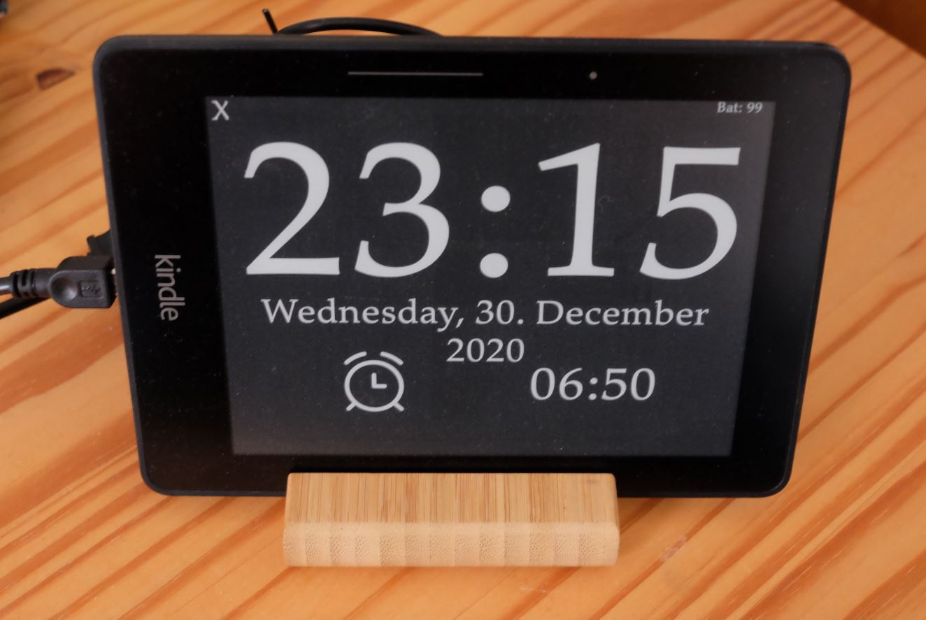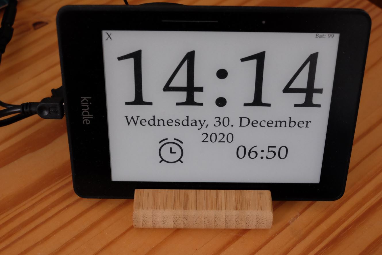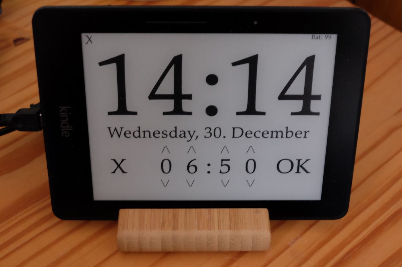 I was searching over a year for an alarm clock, but nothing was fitting my wishes. So I was happy to recognize that the Kindle devices can be rooted and be used as an linux-devices (dualboot). Next was buying one. I found a cheap Voyage and bought it on the spur of the moment. I obviously read the "headline" and was resigned, that the root does only work on old firmware versions. Mine had 5.13.2. But, reading the next pages, there was a chance to get this done with serial-root. Searching - and finding - my old programmer (from playing around with an arduino years ago) results in: no support of 1,8V. Because I do not want to kill the Kindle by trying 2,5V signal level, I bought a new programmer and tried the solderfree needle-way. After spending half an hour for the right timing, to get into the debug mode, rooting was managable. The biggest problem was the large number of (obsolete/old firmware) instructions and getting the relevant informations. Okay, enough of the preface, the result in a nutshell: I was suprised, that on the Kindle is an BusyBox running. Therefore I did not install alpine in dualboot, but builded the alarm on the Kindle-System. Because I am not able to write code in any programming language, but are familiar with linux, I decided to do this in shell. Friends called me crazy - in any language code would be only about few lines - I wrote about 300. Most of this interpreting hard coded touch-events. I started with the following project: https://github.com/mattzzw/kindle-clock Thanks at this point to the project-owner! There is not much left from the original code but the layout, but it helped much! USB-Speaker works per default, but it took me a while to get simultanious charging to work. Nightmode (inverted screen and light at minimal level on) is hardcoded and additional activated, if the level of the lightsensor drops to zero. For my wants, the levels are a bit to coarse, but this is not dramatic. To do: - Snooze and alarm stop is not implemented yet. Alarm (twittering of birds :-D ) plays 15 secounds and alarm is compleated. - in day-mode the Kindel could go to deep-sleep-mode between refreshing of the displayed content. Plan how to do this - and setting alarm and alarmtime without problems - is existing in my mind. - Font size is to large, long names of days causes line break as shown in pictures. Problems: Touch is really tricky and not pleasant to use. But I will describe this in a separate problem-thread. Because it is not "downloading - running - using", and I do not know, whether I am allowed to distribute the leftover code snippets of the github-project, I do not add the code. My next project is a whether-screen. Whetherforecast and display of room temperature and humidity sensors. In this context I tried to get an USB2Ethernet-adapter working, but was not successfull with the Kindle-BusyBox. It would probably not be easier to get a 868mhz receiver to work. So I think it would be realized with an raspberry pi. Delivery service brought just this hour a PW4 I bought used for a really lucky price (is firmware version 5.12.4 rootable? I have to do research ;-) ) Thanks for reading and your interest :-) |