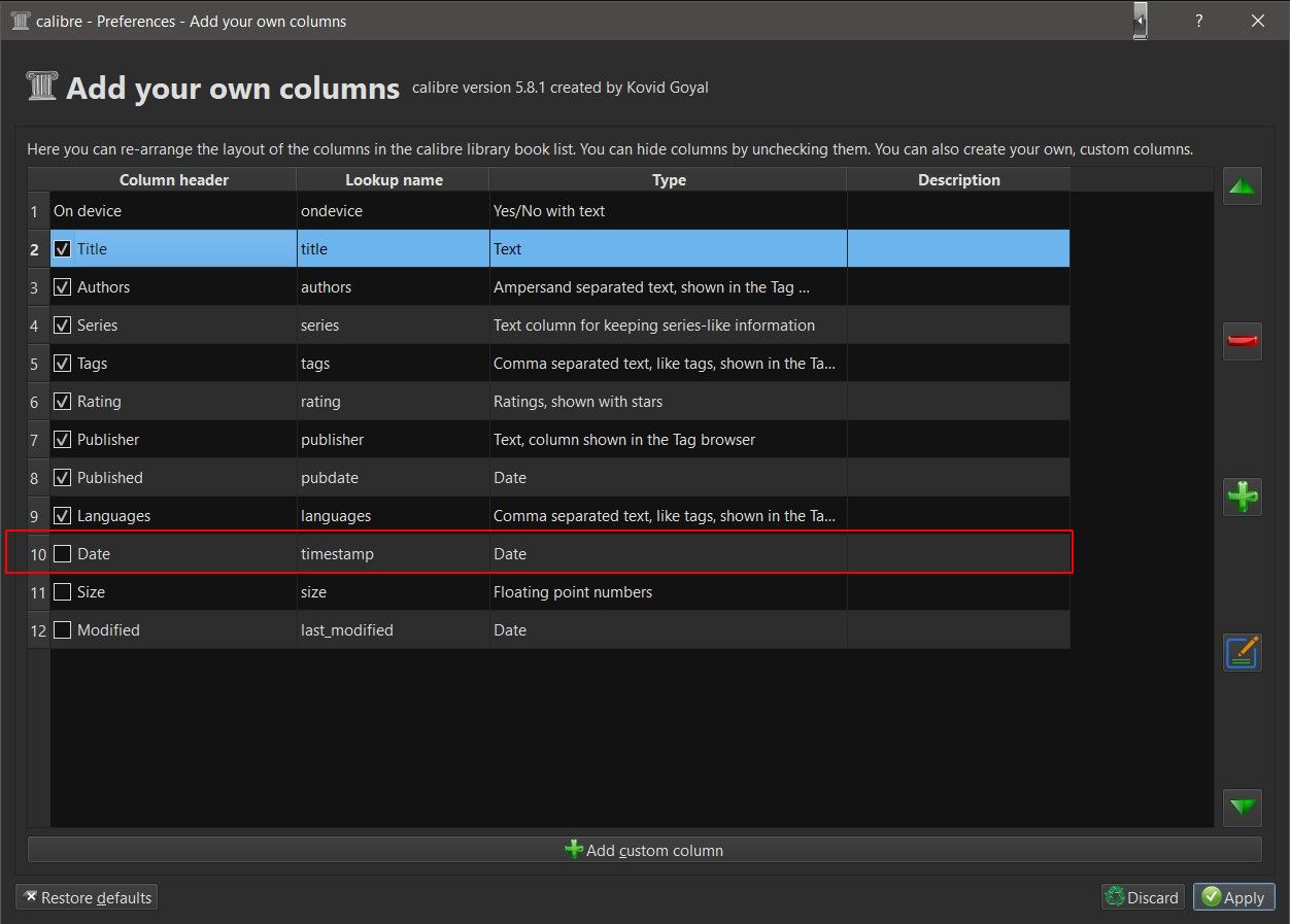But in the book list it shows a lookup name of date I've never understood why. FWIW, I don't need to know when I added a book to a library, so soon after I started using calibre I re-purposed the Date column. When I add a book I clear it with '-', and when I finish reading the book I set it today with '='. This hasn't caused me any grief. I don't connect devices to calibre. BR |
