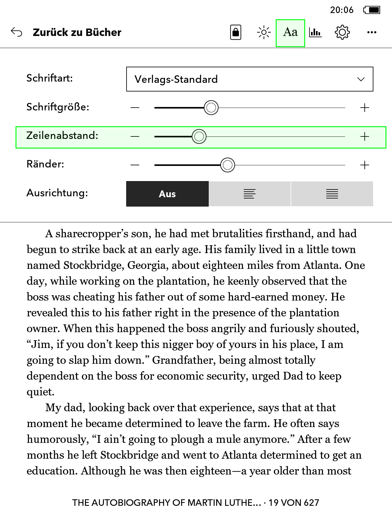 I just noticed that I totally dislike the line-height of the books I read on my Kobo (Libra H20). Most books seem to fill a complete blank line between each and every line ... and therefore waste a lot of space ... so I'm way too often forced to paginate. I have one book where I like the line-height ... there is almost none: And lot's of others, where the wasted space is dis comfortable. The way I load books: normally I use calibre and load books onto the reader with kobo utilities plugin, which does kepub.epub conversion. Just to be sure that this isn't the source of trouble I also tried some epubs converted 'kepubify' but with similar results. What I don't understand in particual is, that the CSS style 'line-height' seems not to be interpreted. I can even set negative sizes (.e.g line-height: 0.5em; ) which will make the book unreadable on calibre viewer, due to overlapping lines. ....but the Kobo is totally resilient to these settings. Is this a known issue? Anything special the kobo store books do that these converters are not aware of? I really see no obvious problem in the stylesheets, but maybe there is a trick? The only thing I found that relaxes the situation a little is to set tiny font size (e.g. 0.8 em) to see more content on one page. But this can get really tedious to read