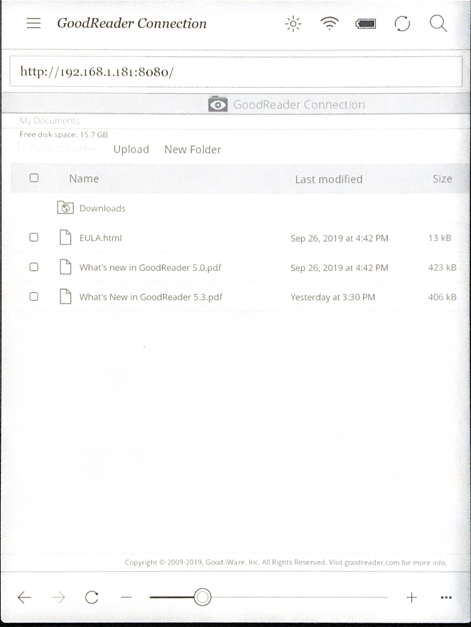 I may not be fully understanding Goodreader WiFi sharing. I opened the WiFi server option in GoodReader and copied the address showing there into my Kobo browser and pressed return. In the Kobo I just got a blank screen whereas in Goodreader it said ‘transfer in progress’. However, although I had selected an ePub file within GoodReader, it didn’t show up on my Kobo. |