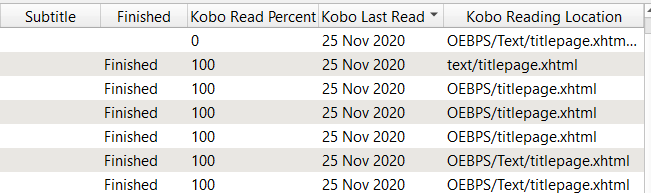 I don't know if the Kindle plugin or the Kobo plugin could change it for me the next time I plug in the ereader, when the book has been finished. Not that it matters in my case because I delete the book as soon as I've finished it. Then when I connect to Calibre I can see the non-new ones that aren't on my ereader and change their Finished column from blank to Yes. It just occurred to me that I ought to figure out how to change the Finished column from blank to No whenever I send a book to my ereader. So a blank in that column would mean not finished and not on the ereader and a red X would mean not finished and on the ereader and the green check would mean finished. Then I wouldn't need to look at the dates. |