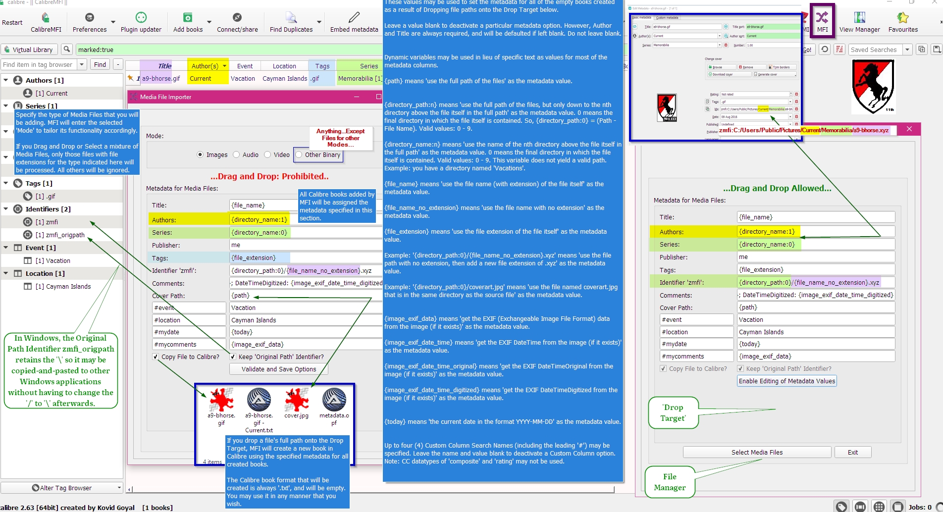 MFI Library Comments: It is highly recommended to use MFI in a "workbench" or "intake" Library, and afterwards to move the new books to your "real" Library. Remember to frequently compress/defragment the MFI Library using the standard Calibre "Library Maintenance > Check Library" menu item. The MFI Library database can grow enormously due to unrecovered SQLite file space. Requires Minimum Calibre Version: 6.0.0 Version History: Spoiler: