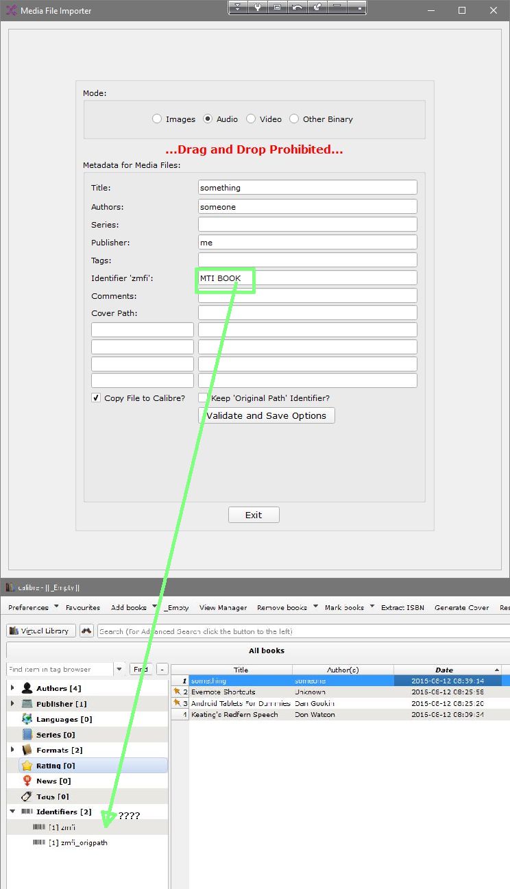 I use View Manager - After this plugin adds a 'book', it is shown in the book list according to the current VM sort sequence, so its hard to find. But when I add a book 'normally' (drop into book list or via File Explorer->Send To) it always appears at the top of the book list (including media files) irrespective of the VM sort sequence, and because I have the relevant setting checked in Prefs->Add books the book is marked. Could the plugin adopt the same behaviour - added books always appear at top of the book list, and they're Marked and Tagged according to Add Books settings. Why didn't I get an 'MTI BOOK' Identifier with this If the Identifiers created by Media File Importer were added into the Preferences->Look and Feel->Book Details->Rules to convert identifiers list, then I think they'd then appear in the Book Details side panel as clickable links. Otherwise I'm not sure what purpose they serve. Publisher always defaults to 'me' irrespective of what I put there. BR Last edited by BetterRed; 08-11-2016 at 08:13 PM. |