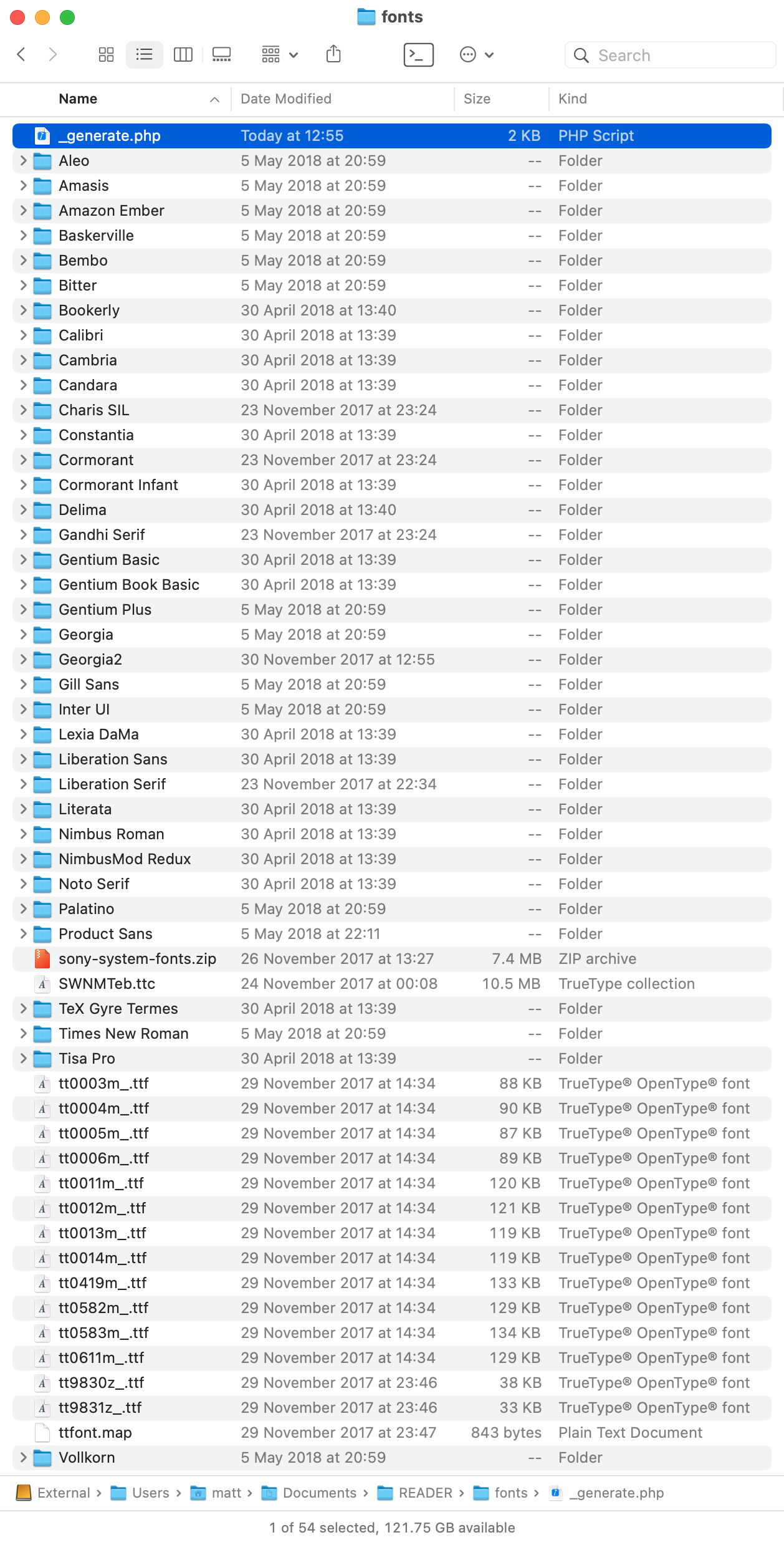 I use this with PRS-650, but it probably applies to most Sony Readers and perhaps some other eReaders. Get in touch if you have an idea how it can apply to other eReaders. It was written back in 2017 but I thought I'd revitalise it with its own thread. source code https://gist.github.com/gingerbeardm...afee9829828ed1 installation Check requirements and dependencies at top of source code. usage Run from the command line without any arguments. location See attached screenshot to see the layout of the fonts folder. Script should be alongside the folders of font families in /READER/fonts output One custom CSS file for each font family is written to /READER/database/system/PRSPlus/epub/ how does it work? Using a python command line tool called font-line: I get the Ascender+Descender sum from the font metrics, and divide 1 by that number. This normalises the values to make the larger fonts smaller and smaller fonts larger. Then I just write that data into the CSS in the required format. plugin? Previously it had been asked if this could be a Calibre plugin but I don't think it's suited to that. Firstly: it does not operate on epub files, and secondly: it would need to be rewritten in Python (I have no interest in doing that). see also NimbusMod Redux font https://www.mobileread.com/forums/sh...d.php?t=292416 Last edited by gingerbeardman; 12-08-2021 at 09:23 AM. |