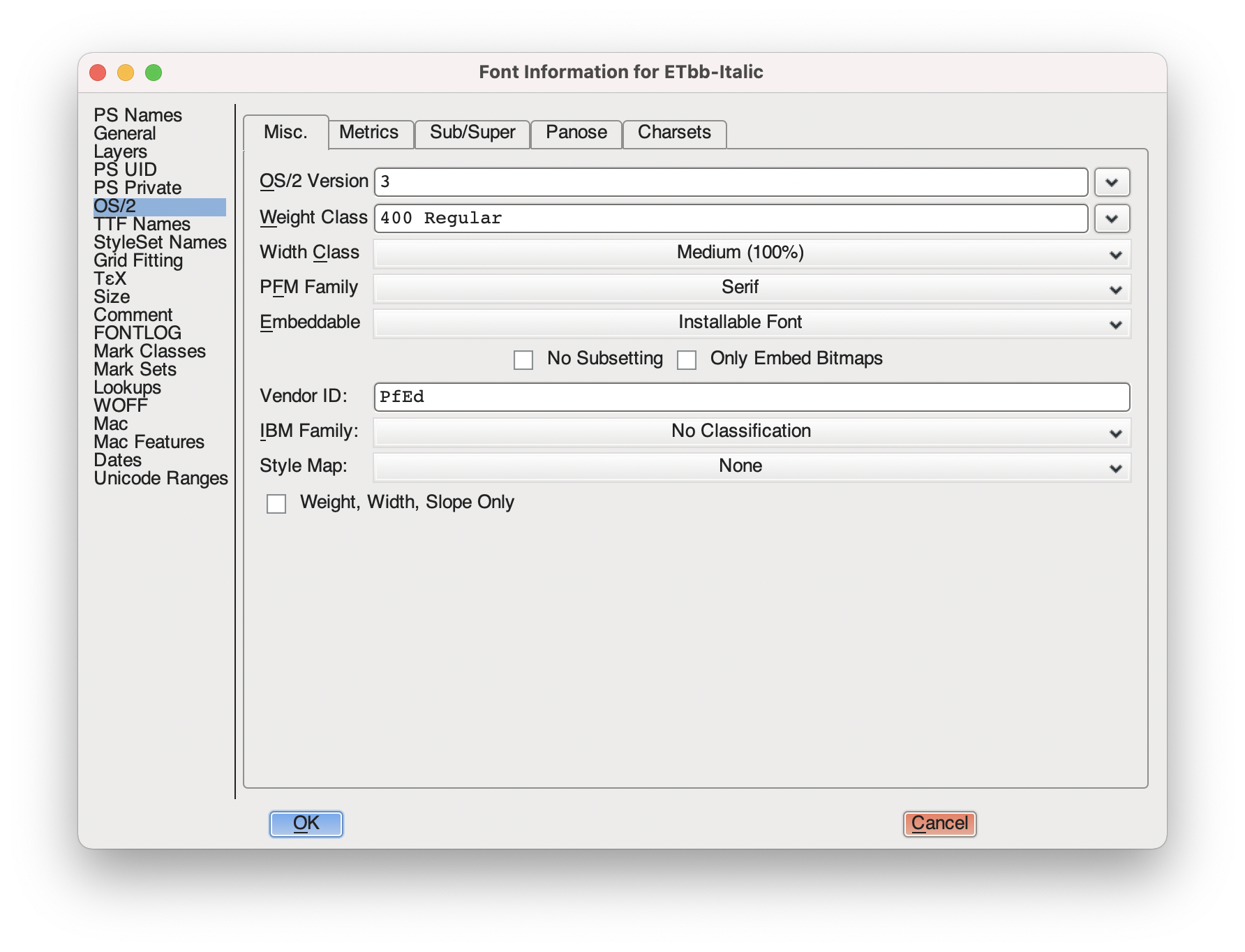 I found the solution. In FontForge, go to Element info -> OS/2> misc -> style map. You need to select "Italic" for the italic version (it was empy). IF you have problems for other fonts, also remember to have a look at Element info -> OS/2 -> Panose -> Weight. It needs to be either Book (for regular and italic) or Bold (for bold and bold-italic). |