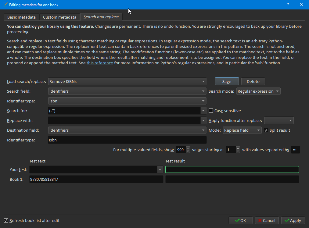 My DB "ISBN" file is corrupted and I would like to delete this data and then run the Extract ISBN Plugin to refresh the data. How do I delete the existing ISBN Data ? and should I? Am I correct saying that the "Identifiers" field shows all the publishers of a particular book and I should delete this field data as well before running the plugin?