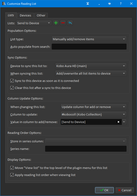 It likely won't work out of the box - the first two actions, in particular, are templates that rely heavily on custom columns. Either fix those or delete them - you'd want to look at "update #kobocoll" anyways because I highly doubt we use the same Kobo shelves. It should be easy enough to follow but if you need help pop over to this thread. For step #3 ("send to device if device is connected"), unless you're using an Aura HD like me you'll want to change the condition to use your actual device name. So plug in your device and do this: Step #4 might be invalid if you don't call your reading list exactly "Send to Device." So just fix it. If you haven't already got that reading list, here's my settings: The last step also uses a template - related to the fanfic thing earlier. If a book's already got #onkobo set to 'yes' and I run the chain on it, it changes to 'no'. Then after it's on device I have a different chain to do a few things (refresh the ToC on the device, re-upload the cover) and set it back to 'yes.' Chances you won't need something like that - I have it almost exclusively for fanfic with new chapters. So you might want to remove the template and change that to a predefined yes. Last edited by ownedbycats; 08-15-2021 at 09:01 PM. |