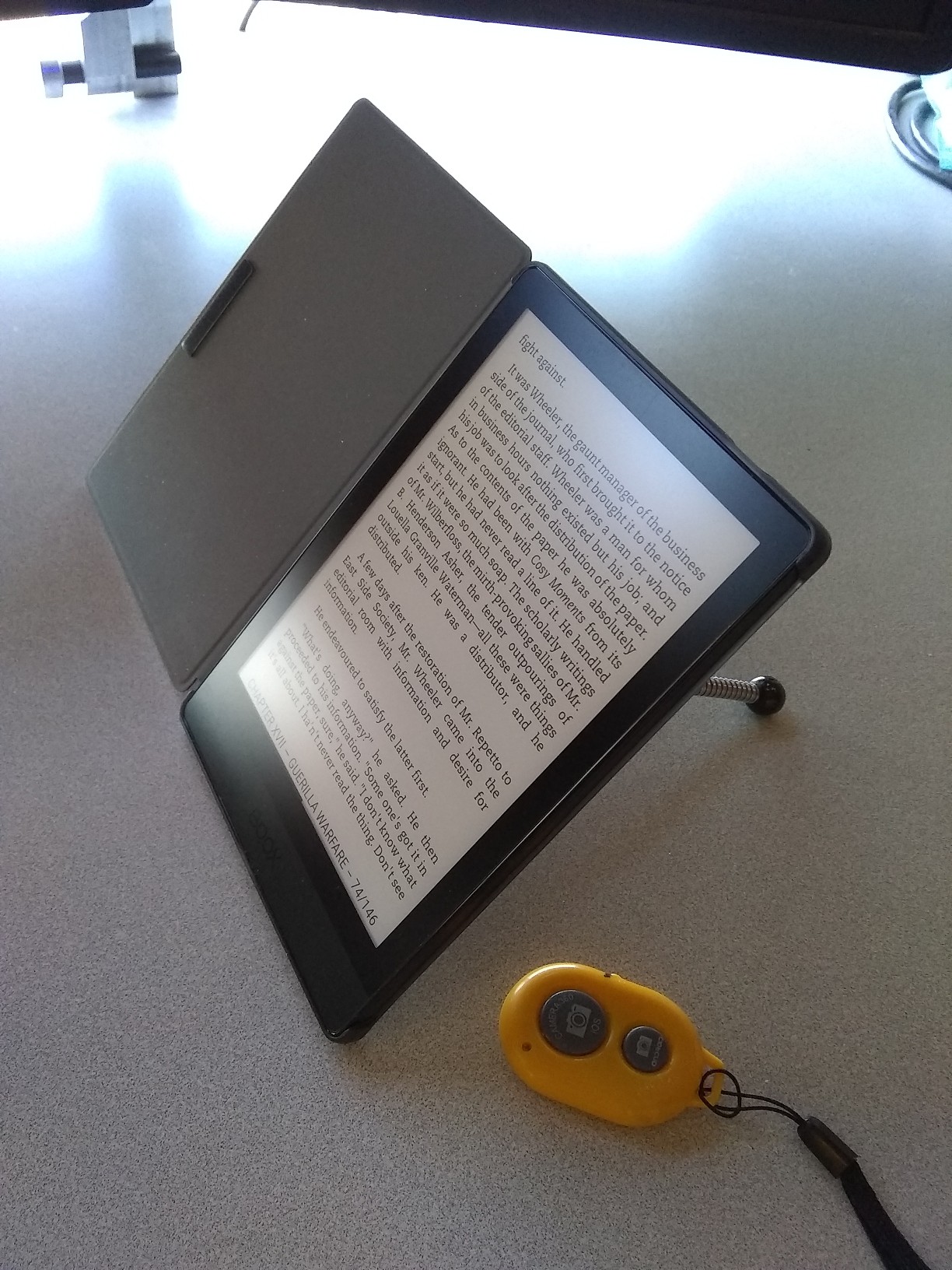 My Poke3 has a cover that I kind of like. I glued the T-nut on the back of the cover instead of directly on the device. I have a "foot" composed of 1/4" set screw, 1/4" threaded coupler and one of the three little gooseneck legs off a mini camera tripod. When I don't need it I can unscrew the leg. Admittedly when you are not using the foot you do have the T-nut still sticking out a bit. It's not that bad. Still, for small (6") devices I find the the foot (or something more ergonometric) is a nice hand hold, like those sticky things on cell phones. I also have a bendy arm over my bed to hold the Poke3. Edit: Or if you want truly low tech, get a scrap of that rubberized drawer liner, the kind that is like a rubber screen. You can use anything as a back support, books or a wooden angle you make yourself or even something else with a tilt stand. Set the liner underneath the back support and the Boox won't slip on the desk. Last edited by Renate; 10-07-2021 at 10:54 PM. |