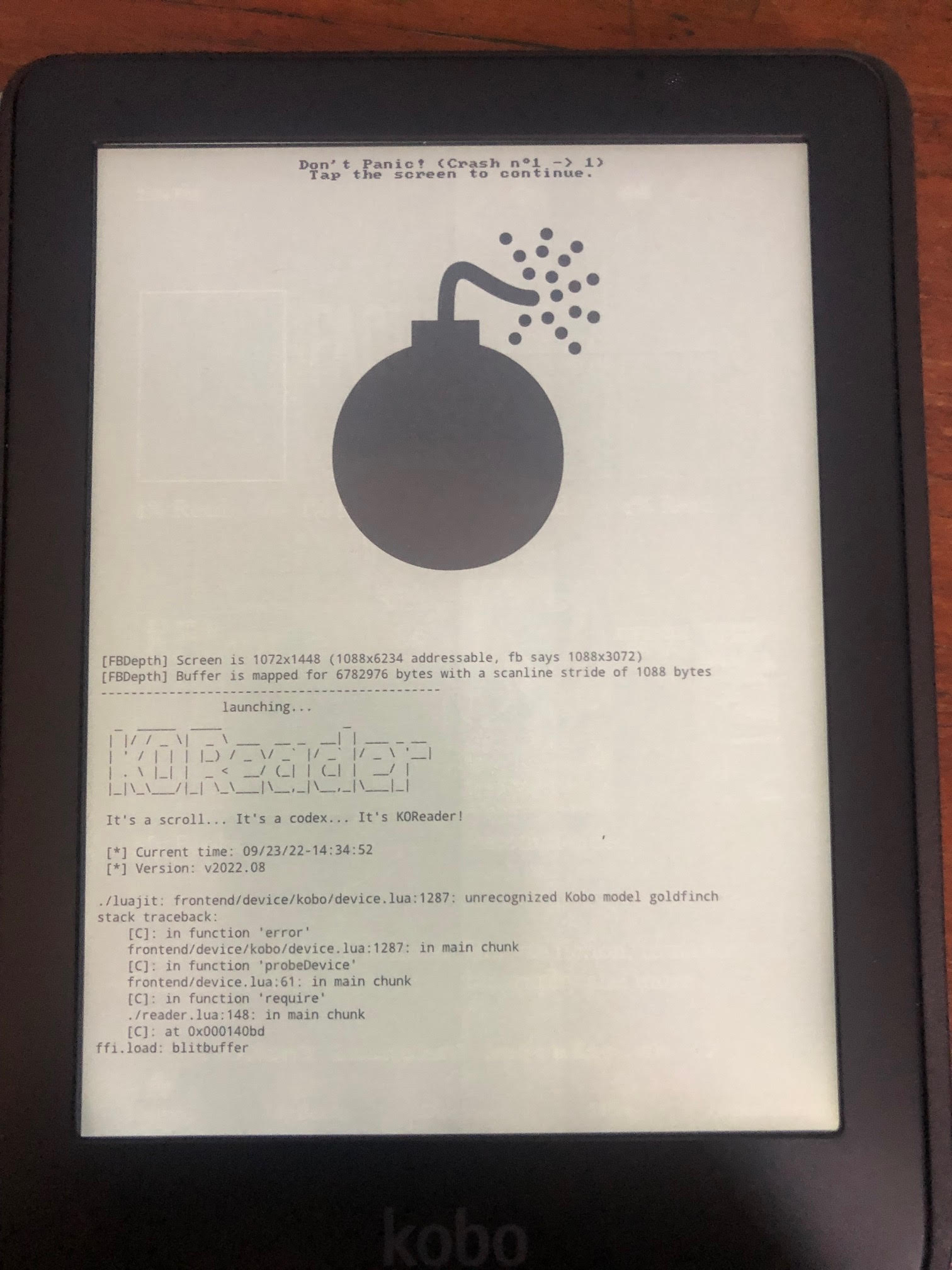I installed KOReader on my Kobo Clara 2E but it crashes and displays an error. It's installed fine on my Kobo Clara HD. The Kobo Clara HD is running an earlier version of the software but the 2E has the latest 4.34.20097.