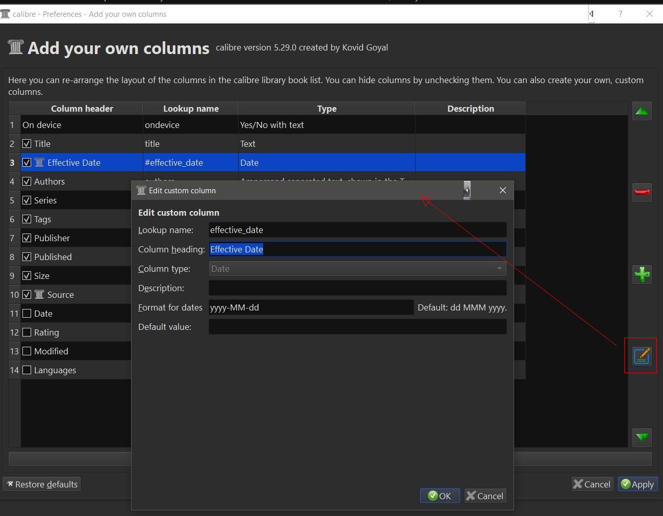 Here is a pic of the definition. Seems to work fine now. Thank you. So there is only the problem left that sometimes the database is omitting books. Normally I do no search. I just open calibre, look at author, check series and if there is a book missing I try to add it. When I am finished I look for duplicates and very often the "missing" book was there and I have a duplicate. What can I do about that? |