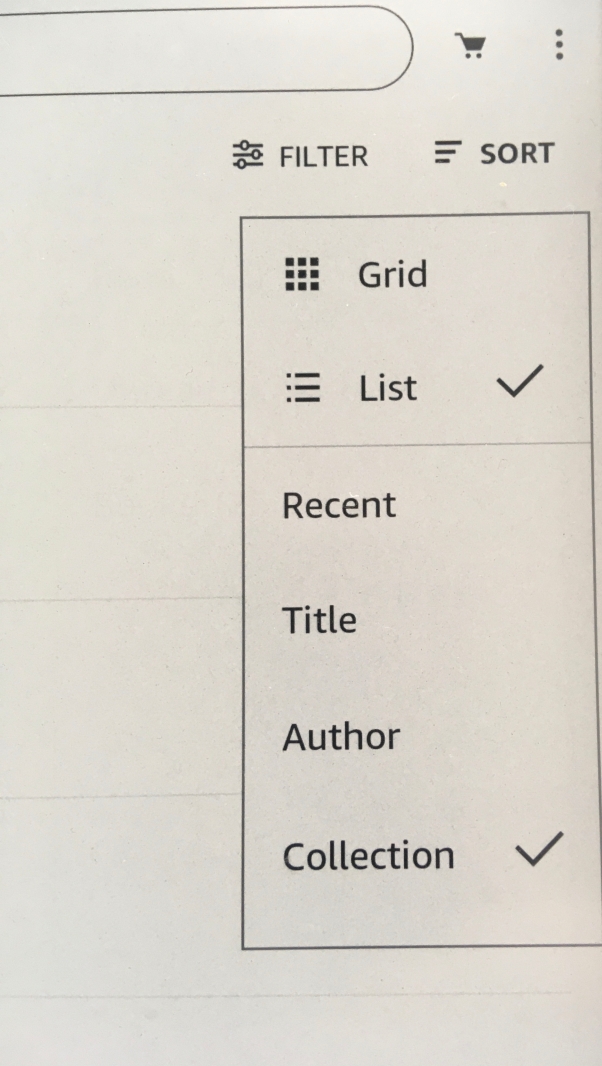 Well that's my point - there is no Collections option under "Filter". I can choose Collections under "Sort" - OR I can choose Recent under "Sort". I used to be able to choose Recent for Collections, and they would show in order of most recently accessed. With this option, no books would show until I opened a collection All my books are in collections.