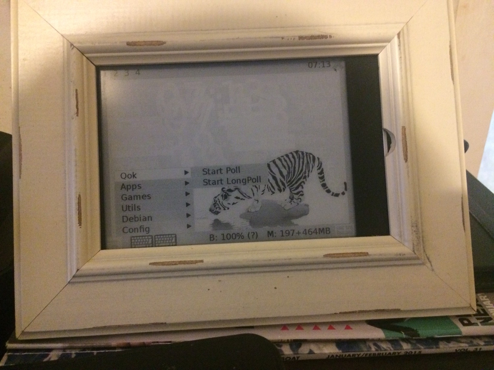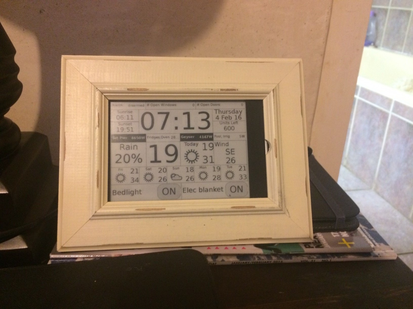 I thought I would share what I have done in terms of using my kobo touch as the dispay interface to my home automation system [www.openhab.com]. I hacked the Kobo with Marek's debian image and used python and qt quick as the language and ui frameworks respectively. The Kobo gets data from openhab via REST and display some of the data available. It also has buttons that can be pressed to switch on bedlights, etc linked to my home automation system. Im displaying the following information retrieved from openhab: - alarm state and open windows and doors - sunrise and sunset times - time and date - electricity units left in the meter - Energy power - total, fridges, geyser, pool, irrigation. - chance of rain, current temperature [from sensors in the house] - forecast temperature for today - wind today - weekly weather forecast - state of my bedlight and electric blanket as button which can switch them on/off as well. Ive added the app called QOK [Qt on Kobo - how original!! ] to the awesome menu.Ive also added UsbNet to the menu, although I use wifi at home. I framed it also using my unused dremel for the waf. Now my next project is to do boat automation using the kobo display in full sun with the intention to use phonegap apps on the android image of kobo. ![]() Here are the pictures: Last edited by issybird; 02-11-2016 at 07:45 PM. Reason: Oversize images deleted. |