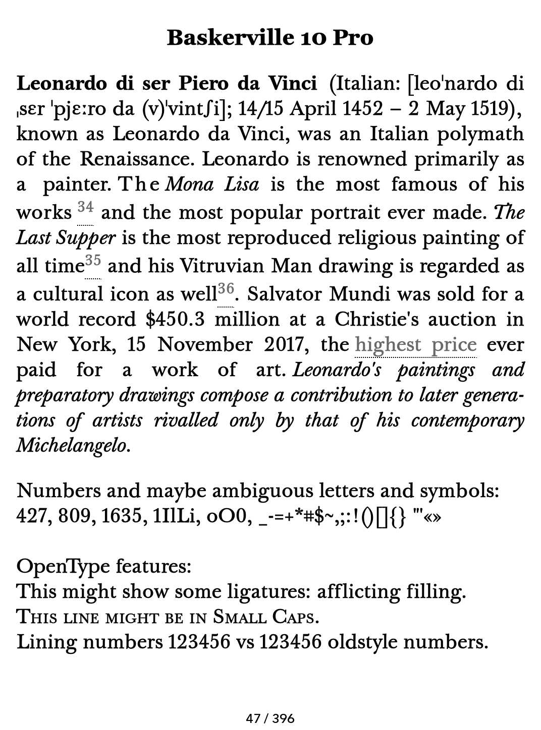 I don't use the menu to change the fonts. KOReader can generate a "test font document" which contains some text which is set to show in every single font installed in the device. This document is in plain HTML format. It is the document RMSDK failed to open. I trimmed the text to fit in one screen, imported the document into Calibre and converted it to ebook format. This way I just go to the next page to see the next font. Don't need to use the menu at all. I just set the font to "Publisher default". The kepub I generated works ok in Nickel, but RMSDK couldn't handle the epub. I was interested in seeing the RMSDK output because Nickel is pretty bad at handling kerning and it does funny things with most fonts when displaying the "[leoˈnardo diˌsɛr ˈpjɛːro da (v)ˈvintʃi]" part of the text. See the difference between Baskerville 10 Pro and IBM Plex Serif in the attached screenshots. BTW, Calibre and the rendering engines in the devices mess it up when the font name contains a word made solely of numbers. Calibre converts every single Code: