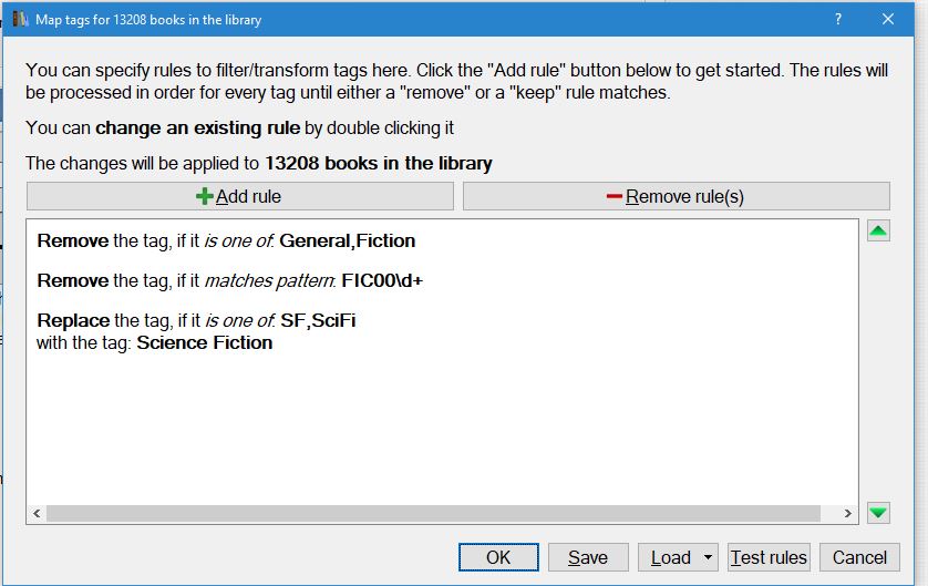 I say Known, because there is no limit on how many Libraries you can have ( would be a nightmare to maintain), only how many Calibre can interact with Quickly (those on the list). FWIW Delete Library only removes the entry from the list, not the structure. BTW that list also is consulted other places (plugins). eg CopyToLibrary only allows the Target to be Known Libraries (you can open any Library from the command line,without it being on the list) Tags: They are there to help you, NOT to sell books (by stupid keyword search with every synonym or typo) or replicate old style Card Catalogs Normalize your data. You do not need 42 ways to spell Magic. 19 permutations of Werewolf... I also decide whether to us a Singular or Plural version for a tag (I lean to Singular) and IMHO the most dumb one of all 'Fiction. Science Fiction' My Library is mainly Fiction. I do not need to tell anyone that Fantasy (the tag) is a subset of Fiction. Gone Non-Fiction (preface is used to separate those from the Fiction use of the keyword) Non-Fiction.Biography.Fantasy Writers and FYI Calibre is a Relational Database. What you see is a Flatten Display of the data When you make a column entry. it adds or reuses the base table Definition (Use of the Manage context in the Tag Browser allows for renaming, whilst not breaking the Usage) for that column. And if you rename to an existing Tag, it merges the usage, thus making that activity, simple. (I routinely go thru mine to weed out those that slip thru my Intake process) Fantasy gets an Index#, any book that gets Tagged Fantasy, really links to the Index (long Int, not the text). Very data file efficient Consider reworking to a tighter set of Libraries that address 1)Security (little eyes, Classified ...) 2)Structural (additional columns, or different fixed data allowed) needs not covered in basic metadata AND only used by a tiny subset of entries. Technical Publications need specific items tracked. Columns are for fast searching and ordering. There are tools to search Comments (slow) for obscure terms |