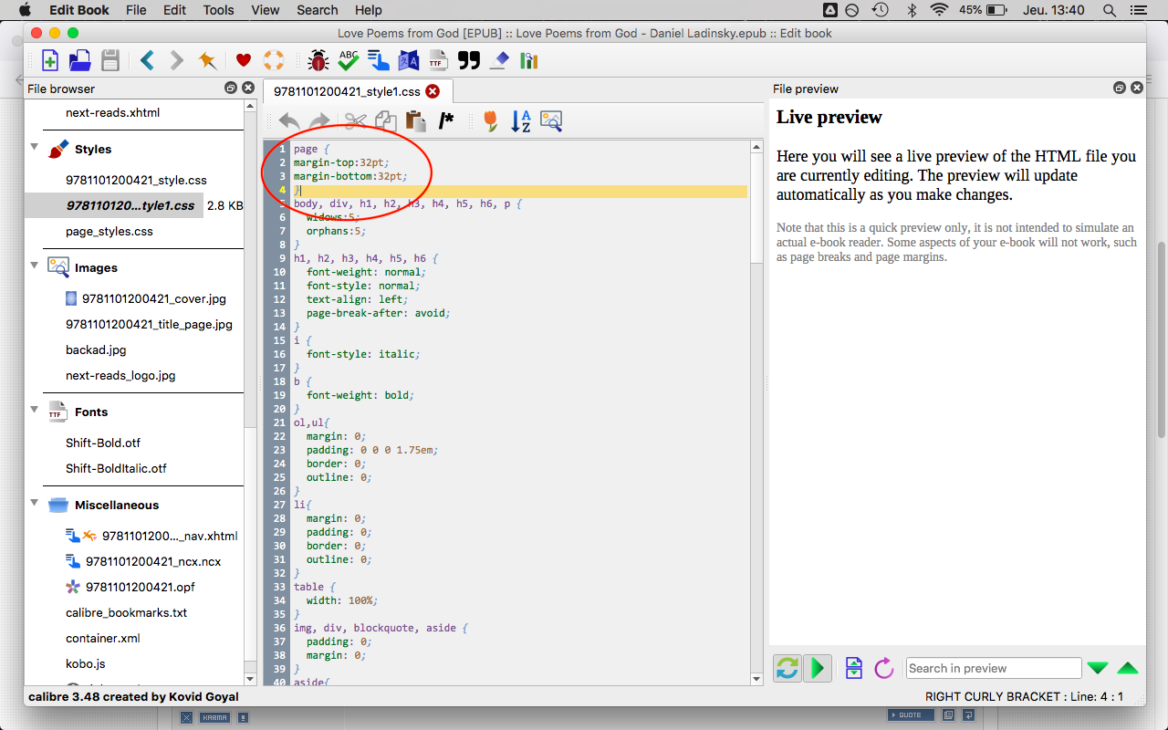 I'm looking to increase the top and bottoms margins so that the first and last lines aren't so close to the edges. I've seen another thread on this topic (link below) which suggests to inject the following code into each book. I'l happily do it, I just don't see where to inject it. Any directions? Thank you! Code: