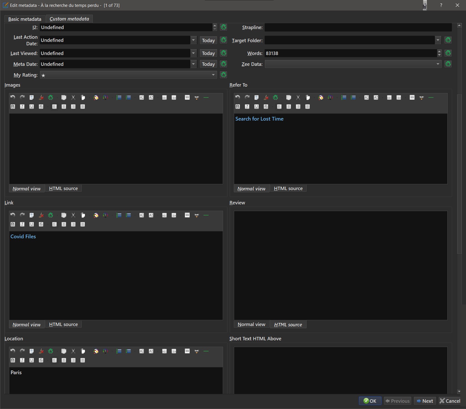 If a column is 'Protected' via JS, the setting survives a Library Check (database vacuum) but not a Library Restore. But there's a bigger catch-22: if a custom column's 'editable' flag is set to 0 (which is what JS does) the custom column is indeed hidden in MDE… and, in the Book List it becomes Read Only, so no F2. Which makes sense to me, even though it's not what I want. Another option would be a button for each custom long text column (that popped the long text editor, a'la F2 in the book list) rather than embedded sub-dialogues - that would get rid of the clutter and make navigation easier. The attached screen shot shows an extreme example of the issue I'm seeking to address. BR Last edited by BetterRed; 01-31-2022 at 09:09 PM. |