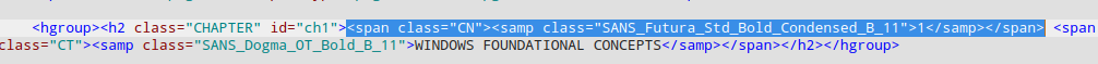 I'm trying to delete all 'span' tags with no content (i.e. <span blah blah>(nothing here)</span> by using the following RegEx (with minimal match enabled) <span .*></span> Here is some example text which shouldn't match anything <hgroup><h2 class="CHAPTER" id="ch1"><span class="CN"><samp class="SANS_Futura_Std_Bold_Condensed_B_11">1</samp></span> <span class="CT"><samp class="SANS_Dogma_OT_Bold_B_11">WINDOWS FOUNDATIONAL CONCEPTS</samp></span></h2></hgroup> As we can see, there are no span tags without content. Running this RegEx however matches the following text (as can be seen in the attached screenshot) <span class="CN"><samp class="SANS_Futura_Std_Bold_Condensed_B_11">1</samp></span> Is there anything I have missed, or is this indeed an error? Rgds Karl |